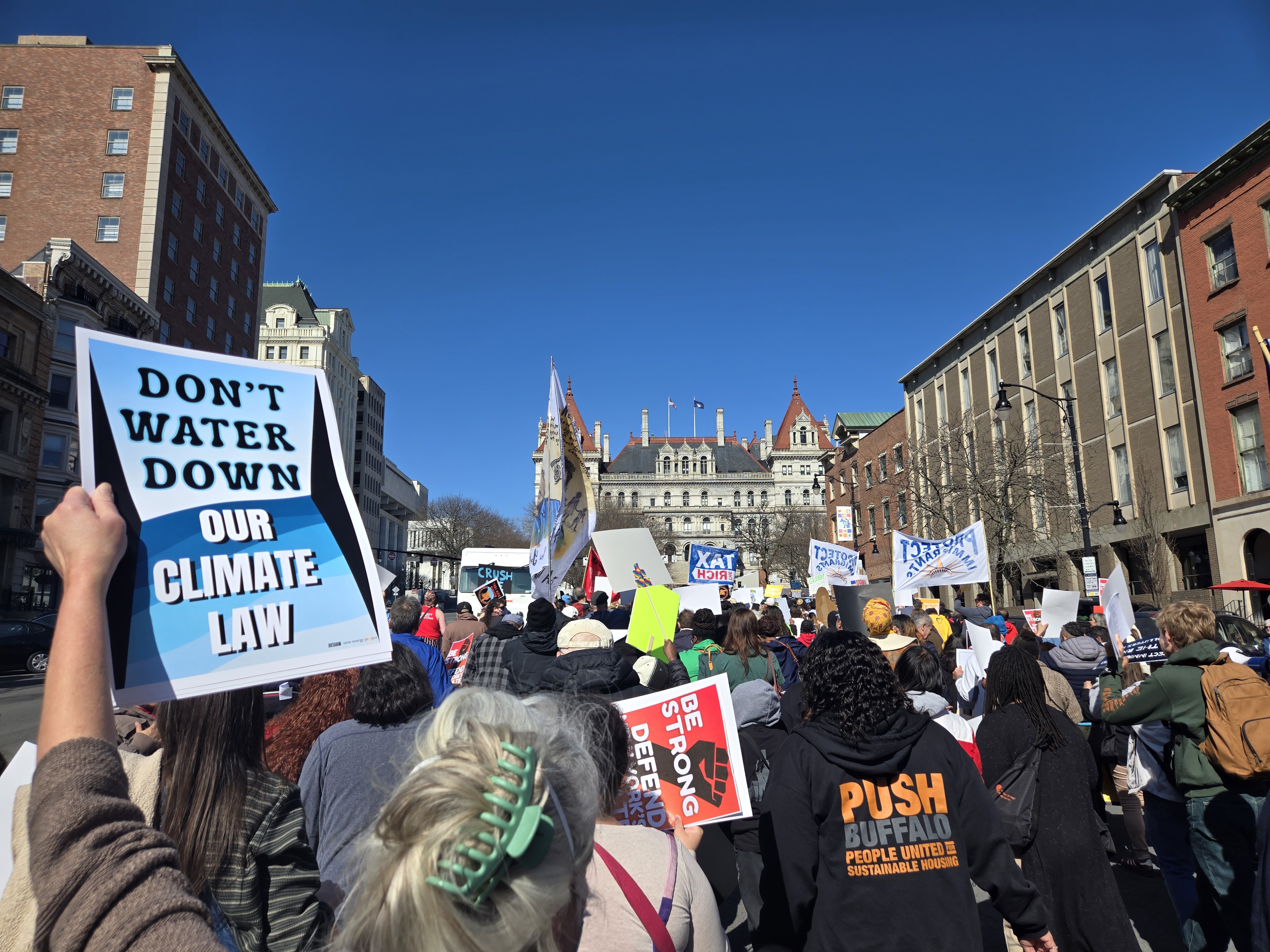You may have heard murmurs about the late state budget this session. It is being held up by Governor Hochul, who is hellbent on using the budget process to water down the metrics of the Climate Leadership and Community Protection Act, derailing years of work and planning by state agencies and legislative leaders who are ready to implement actions to meet our greenhouse gas emissions reduction goals. Al mismo tiempo, she is also shopping around an alternative to the NY4All act, which would water down the protections against mass deportation that immigration justice advocates have been developing over several years and fighting for. Take action now – send a letter using the links below. Clean Air members and staff hopped on a bus and joined thousands of our peers with NYRenews in Albany earlier this month for a rally and protest in the Capitol Building – for many, it was the first time they’d experienced a chance to talk directly with their lawmakers, and for some it was the first time they’d ever been to Albany! At the bottom of this news round-up are several photos. We also led a protest a couple weeks ago outside of Governor Hochul’s press event in Cheektowaga, again echoing these points – while this was a smaller turn out than the thousands we stood shoulder to shoulder with in Albany and at No Kings, we’re proud that with just a few hours notice we were able to bring together a group of WNY residents to lead a rapid response action and speak out about the Governor’s attempted authoritarian rollbacks of our laws. |